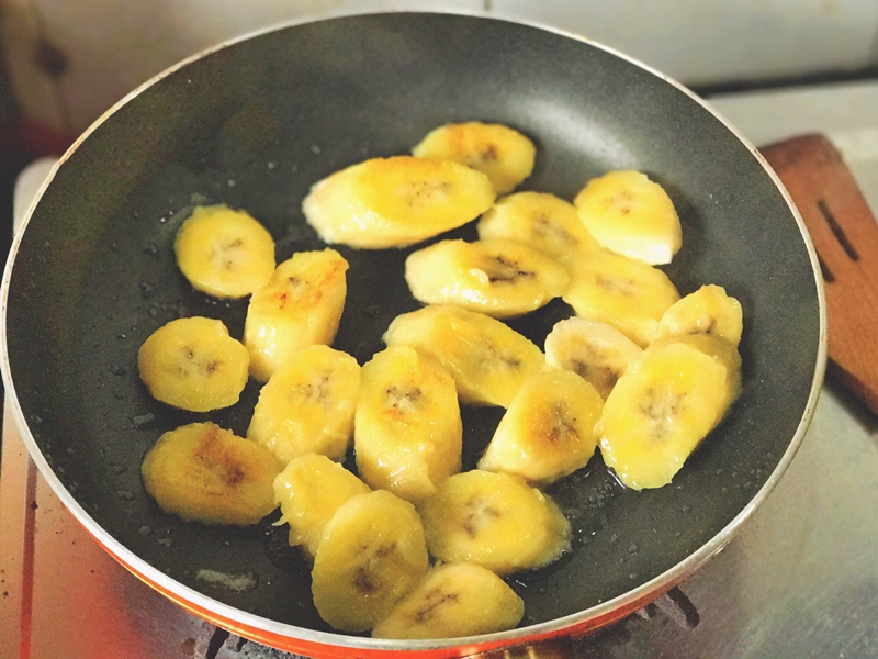 2 Chiên chuối Bóc vỏ quả chuối còn lại sau đó thái lát chéo. Cho dầu dừa vào chảo đun nóng rồi cho chuối vào chiên chín vàng hai mặt thì tắt bếp.