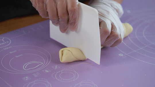 Sau thời gian ủ, lấy bột ra rồi chia làm 3 phần. Nhào các viên bột thành hình tròn, rồi dùng màng bọc thực phẩm bọc kín. Để bột nghỉ thêm 15 phút.